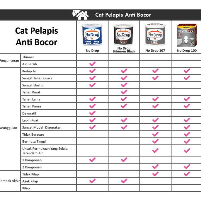 55.000 / 1 kg dan rp. Produk cat anti bocor dari pt propan raya icc diantaranya ultraproof dan ultradry. No drop adalah cat pelapis anti bocor yang memiliki sifat elastis, kedap air serta sangat tahan cuaca sehingga sangat cocok untuk digunakan pada permukaan . Jual no drop cat waterproof dekoratif 4kg/cat pelapis anti bocor/avian bagus dan murah di jual oleh ribuan toko online di indonesia | inkuiri.com. Pelapis anti bocor yang berkualitas, elastis dan melindungi rumah anda .